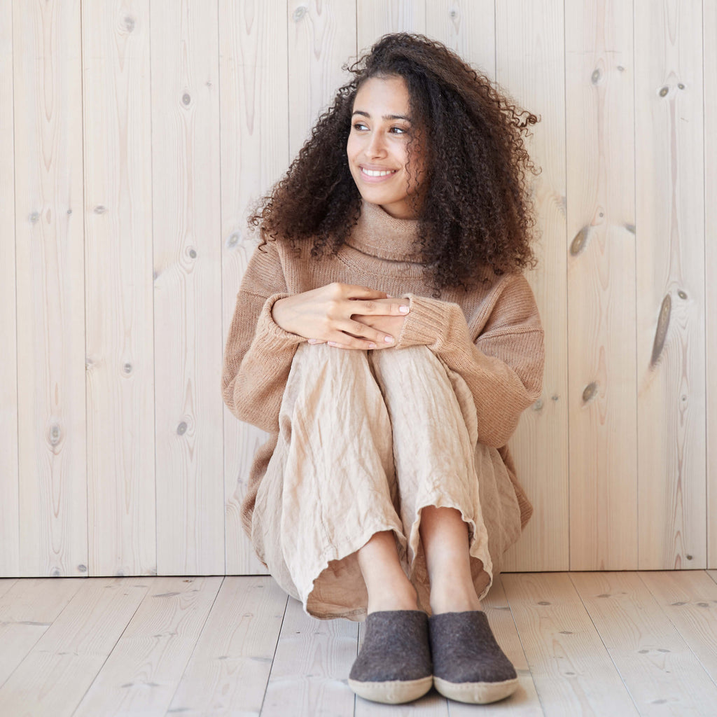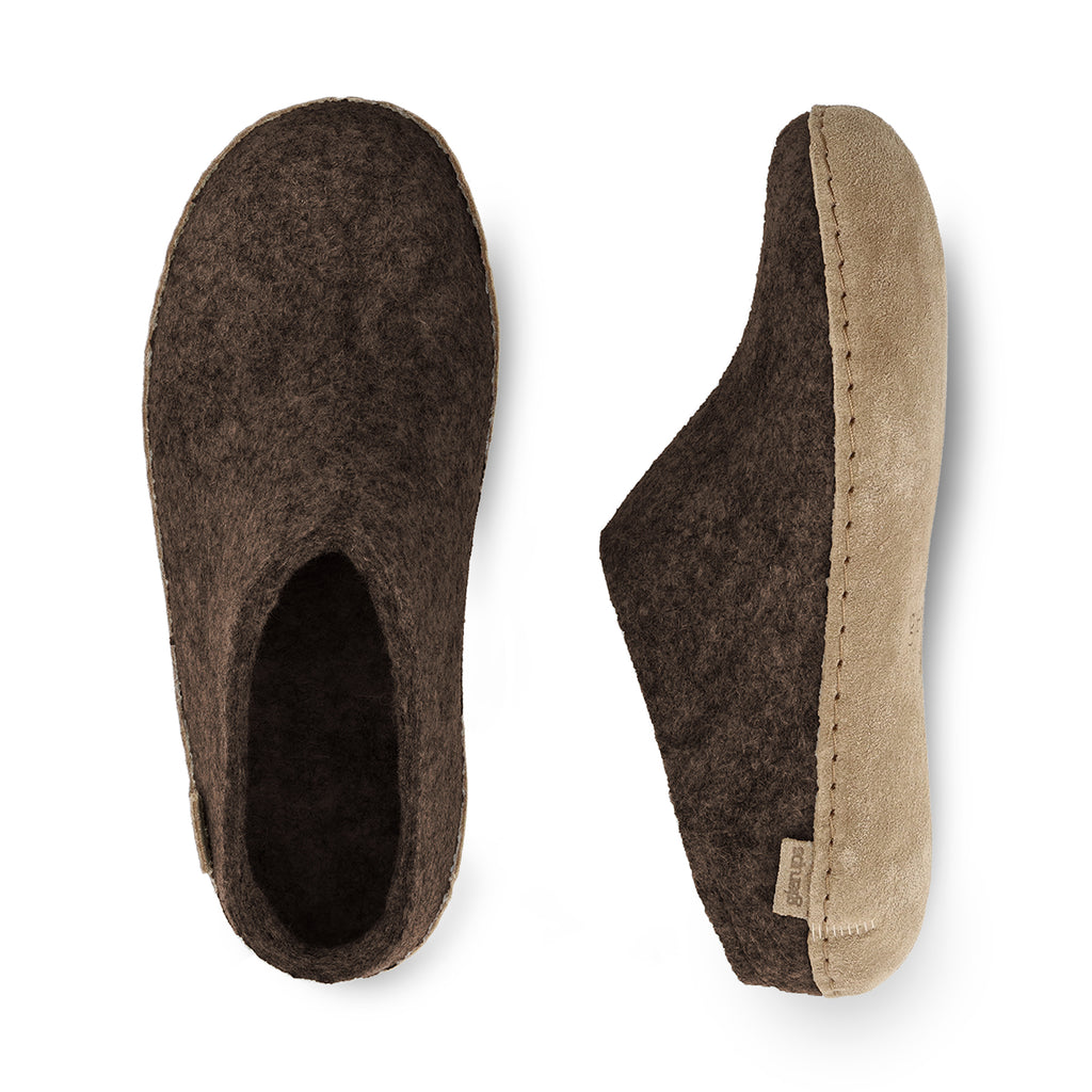 Tøffel hjemmesko lavet af 100% ren, naturlig uld i klassikerfarven naturbrun, med en sål af blød og kromfri kalveskind. Vi startede med at lave futter for over 30 år siden – og faktisk lavede vores grundlægger Nanny Glerup de første par futter som en kærlighedserklæring til hendes mand Ove.